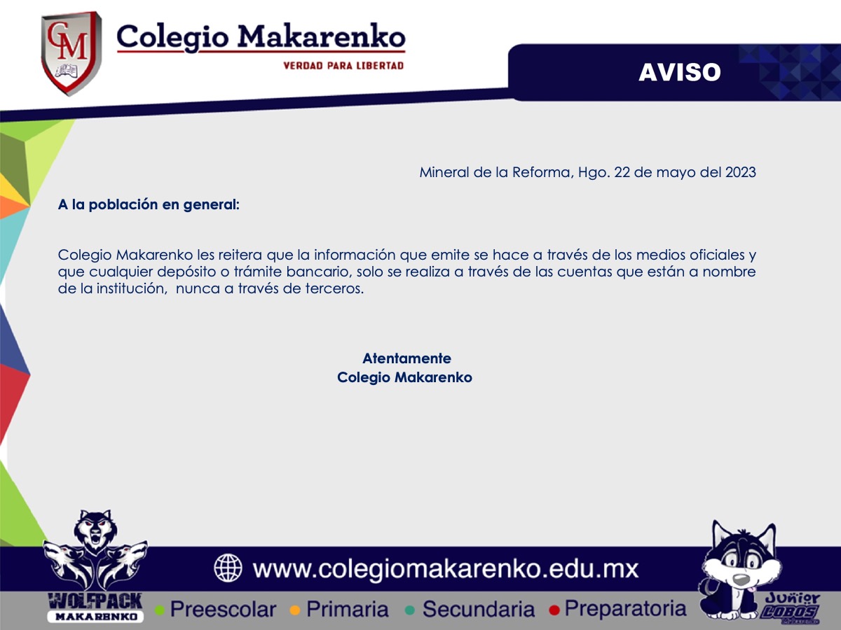 COLEGIO MAKARENKO A.C. mejor conocido como COLEGIO MAKARENKO, con domicilio en  Libramiento a Tampico s/n Col. Santiago Jaltepec, Mineral de la Reforma, Hidalgo, C.P. 42182 país  MÉXICO, y portal de internet www.colegiomakarenko.edu.mx, es el responsable del uso y protección de  sus datos personales y al respecto le informamos que el presente aviso de privacidad se sujeta a la  reglamentación en términos de lo previsto en la Constitución Política de los Estado Unidos Mexicanos, Ley  Federal de Protección de Datos Personales en Posesión de los Particulares y demás lineamientos del  aviso de privacidad, para los efectos jurídicos conducentes, por lo que se manifiesta lo siguiente:   Los datos personales que recabamos de usted, los utilizaremos para las siguientes finalidades que son  necesarias para el servicio que solicita: