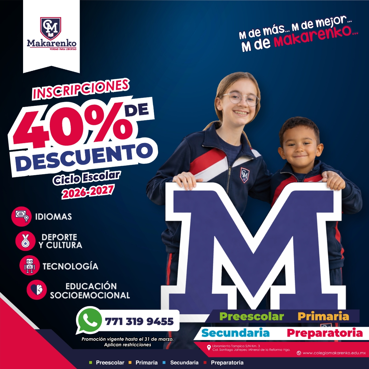 COLEGIO MAKARENKO A.C. mejor conocido como COLEGIO MAKARENKO, con domicilio en Libramiento a Tampico s/n Col. Santiago Jaltepec, Mineral de la Reforma, Hidalgo, C.P. 42182 país MÉXICO, y portal de internet www.colegiomakarenko.edu.mx, es el responsable del uso y protección de sus datos personales y al respecto le informamos que el presente aviso de privacidad se sujeta a la reglamentación en términos de lo previsto en la Constitución Política de los Estado Unidos Mexicanos, Ley Federal de Protección de Datos Personales en Posesión de los Particulares y demás lineamientos del aviso de privacidad, para los efectos jurídicos conducentes, por lo que se manifiesta lo siguiente: Los datos personales que recabamos de usted, los utilizaremos para las siguientes finalidades que son necesarias para el servicio que solicita:
